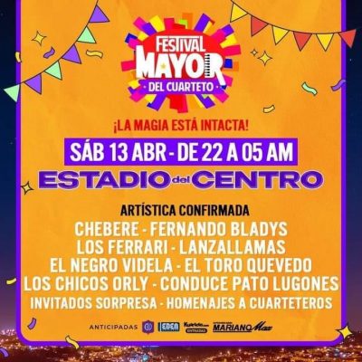 En su primer edición, el Espectáculo Mayor del Cuarteto se presenta como un medio para que aquellas grandes bandas cuarteteras que no han tocado en los festivales lo hagan por primera vez. Como un homenaje a los grandes del tunga tunga el sábado 13 de abril el ritmo cordobés sonará toda la noche en el Estadio del Centro con artistas de primer nivel.